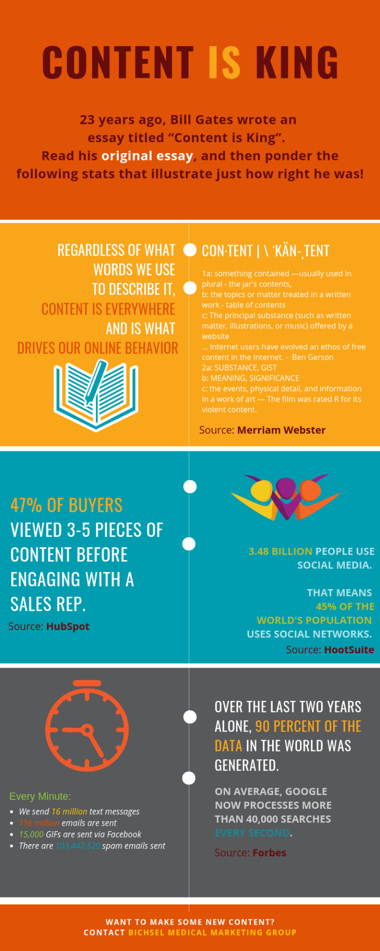 Leaving the critique of content aside, we’ve assembled a few of the most astounding facts about just how much content has reigned over our lives since Bill Gates wrote his famous essay. From the number of posts or emails every second to the compounding collection of data taking over the world, we think you’ll find our Content is King Infographic worth looking over. If you need help making sense of technology or defining a way to create your content in the right path for your audience, please reach out to us. We’ll be glad to sit down and have a discussion, pen and paper in hand!