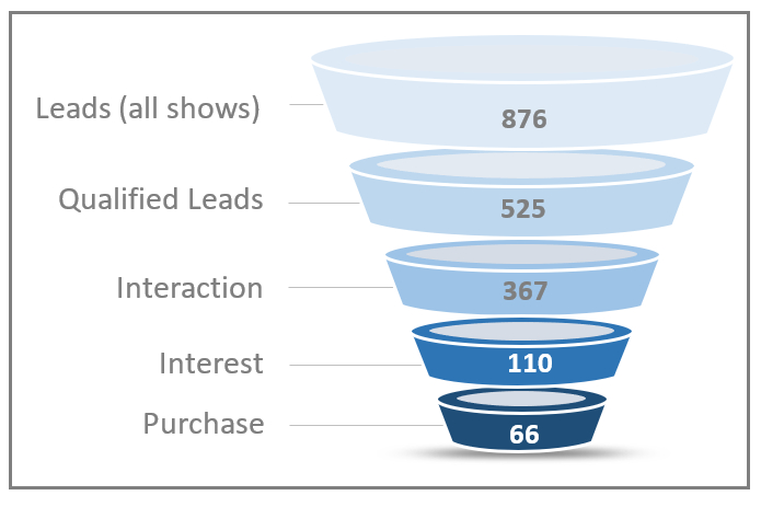 In this example, 876 total leads were collected. Of those, 525 were identified as qualified leads. From the pool of qualified leads, there has been interaction with 367, interest was expressed by 110 of those, and so on. With this level of detail, you’ll have a better understanding of your success and how you may need to adjust efforts in the following year.